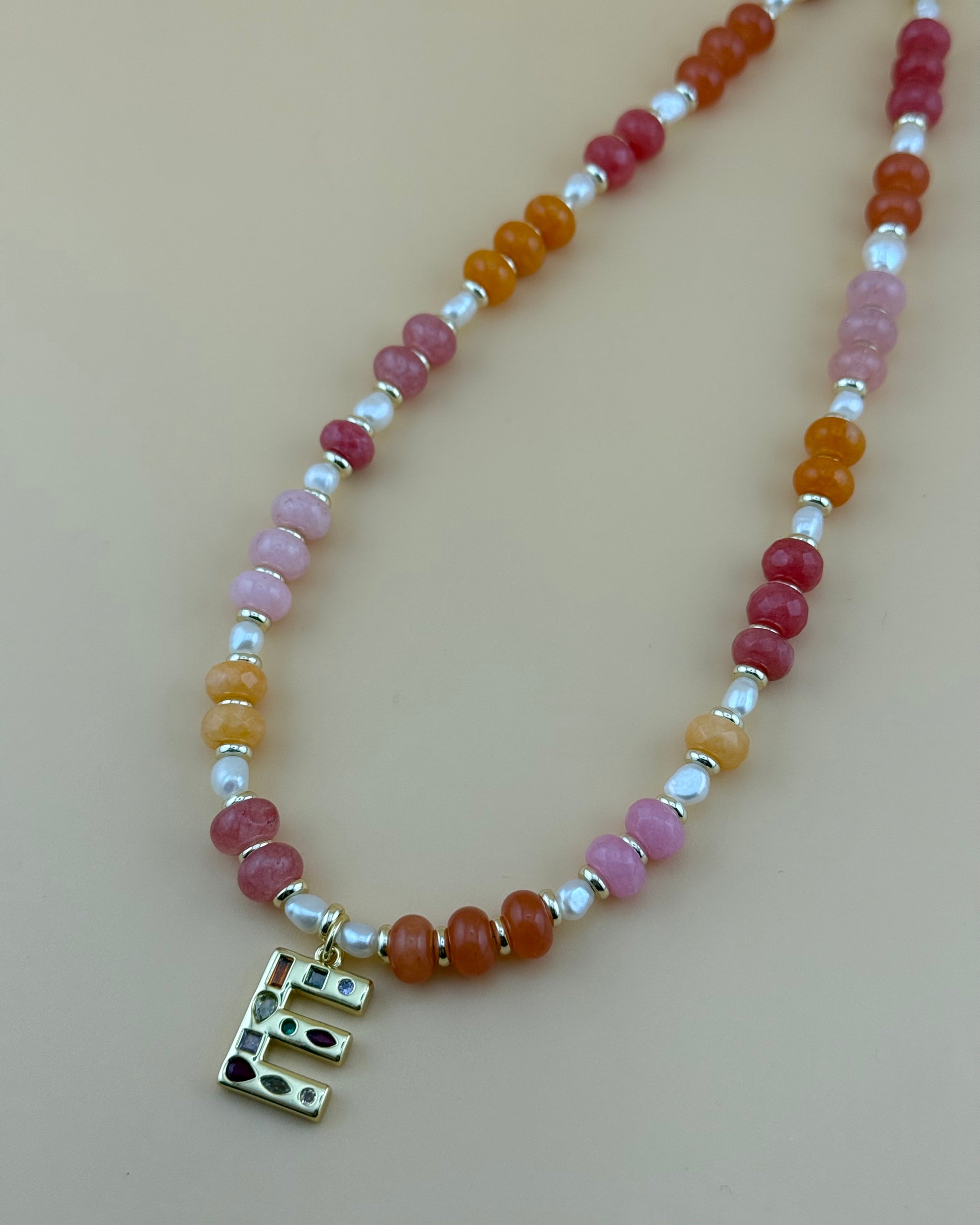 The Dusk necklace features AAAA grade freshwater pearls, and a mix of crystal beads in gorgeous sunset coloured hues with gold filled spacers, hardware and YOUR CHOICE OF ONE INITIAL PENDANT
