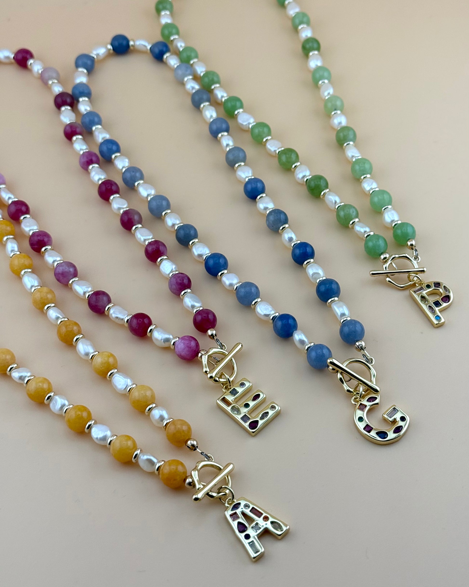 The Tropica necklace features AAAA grade freshwater pearls, your choice of coloured crystal beads with gold filled spacers, hardware and YOUR CHOICE OF ONE INITIAL PENDANT.
